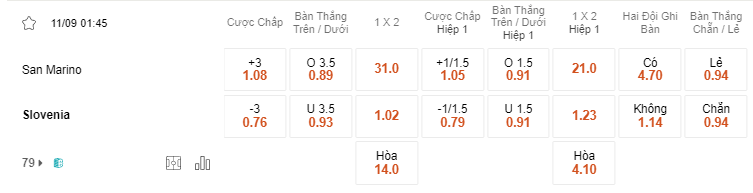 San Marino và Slovenia cũng sẽ có màn so tài trong vòng đấu thứ 6 tới đây tại bảng H vòng loại Euro. Hiện tại San Marino đang thể hiện một phong độ khá tệ sau 5 trận ra sân tại giải khi để thua cả 5 trận trong đó có tới 4/5 trận đội tuyển San Marino để thua với kèo tài trên 2 bàn điển hình với trận thua đậm nhất 0-6 trước Phần Lan. Trong khi đó đội tuyển Slovenia tưởng chừng như sẽ không có chỗ đứng tại bảng đấu tuy nhiên toàn đội lại đang thể hiện phong độ khá ổn sau 5 trận đấu với 3 chiến thắng, 2 trận hòa cùng 1 trận thua để vươn lên vị trí top 3 với 10 điểm, trong đó Slovenia có 1 chiến thắng với kèo tài trong trận thắng 4-2 trước Bắc Ireland vừa qua. Với một kèo đấu khá chênh lệch này khả năng kèo Tài với tỷ lệ 3.5 hoàn toàn khả thi dành cho Slovenia khi đây sẽ là một cơ hội tốt để đem về cho mình 3 điểm tiếp theo trên sân khách.