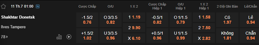 Kèo xiên ngon 11/7 Shakhtar Donetsk vs Ilves, Europa League
