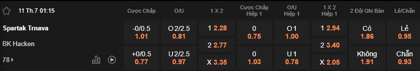 Trận so tài tiếp theo diễn ra cùng ngày 11/7 này đó sẽ là màn đối đầu giữa Spartak Trnava và BK Haecken tại vòng loại 1 thuộc giải Europa League. Nhìn về kết quả ra sân của hai đội giai đoạn gần đây, với Spartak Trnava mùa trước dù về đích ở vị trí top 3 giải Slovakia tuy nhiên chiến thắng cuối cùng trước Ruzomberok trong trận chung kết đã giúp Spartak Trnava lên ngôi vô địch Cúp SLovakia, bên phía Haecken hiện tịa ở giải VĐQG Thụy Điển toàn đội đứng ở vị trí top 9 và có cho mình 18 điểm trên BXH. Nhận xét về khả năng nổ kèo Tài Xỉu của hai đội, trong 5 trận ra sân gần nhất Spartak Trnava có 1 lần đạt kèo Tài 2/2.5 FT với tổng 4 bàn/trận, với Haecken họ cũng có được vỏn vẹn 1 trận nổ kèo Tài với tổng 2 bàn. Dựa trên thành tích đạt kèo của hai đội, tới đây các chuyên gia tại soi kèo xiên đang đánh giá cao khả năng kèo Xỉu 2/2.5 FT là kết quả cho màn đối đầu này.