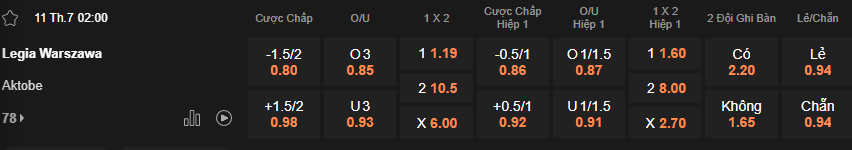 Legia Warszawa và Aktobe là cặp đấu cuối cùng của chuỗi kèo xiên ngày 11/7 này diễn ra tại vòng lại giải Europa League. Nhận định về kết quả đạt kèo Tài Xỉu của hai đội trong vòng 5 trận ra sân, về phía Legia Warszawa hiện họ đang có cho mình tất cả 1/5 trận nổ kèo Tài với tổng 4 bàn/trận, bên kia Aktobe tương tự cũng chỉ có 1/5 trận nổ kèo với tổng 3 bàn/trận. Cũng căn cứ từ kết quả đạt kèo Tài Xỉu của hai đội, tiếp tục kèo Xỉu 3 FT sẽ là lựa chọn được đánh giá an toàn cho nhà đầu tư.