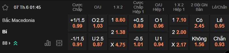 Bên phía đối diện Bắc Macedonia bắt đầu sớm hơn so với đối thủ của mình 2 trận và thành tích ra sân của họ đang khá ổn với vị trí đầu bảng kiếm về 4 điểm từ 1 chiến thắng và 1 trận hòa. Sau khi đánh bại Liechtenstein với tỷ số áp đảo 3-0 thì mới đây Bắc Macedonia đã gặp khó khăn khi chạm trán với Wales, sau hơn 90 phút thì phải tới phút bù giờ thứ nhất Bắc Macedonia mới có bàn thắng đầu tiên do công của B. Miovski tuy nhiên họ lại ngay lập tức để Wales cầm hòa cũng như chia điểm đáng tiếc. Tới đây Bắc Macedonia phải đứng trước nguy cơ cao để mất điểm ở vòng đấu thứ 3 này khi đối thủ của họ là tuyển Bỉ khác biệt hơn hẳn so với những cái tên còn lại, hiện các chuyên gia từ nhà cái đang không đánh giá cao đội chủ nhà để đạt kèo chấp trong trận đối đầu này.