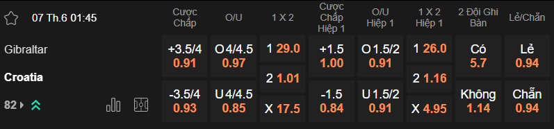 Trận cầu cuối cùng của kèo xiên ngày 7/6 diễn ra tại bảng L VL World Cup đó sẽ là màn đối đầu giữa Gibraltar vs Croatia. Về thành tích ra sân, với Gibraltar họ đang chơi nhiều hơn so với Croatia 2 trận tuy nhiên để thua cả 2 tụt xuống vị trí top 5 cuối BXH trong khi Croatia chưa chơi trận nào đang đứng ở vị trí top 3. Về khả năng nổ kèo Tài Xỉu, trong vòng 5 lần ra sân trở lại đây Gibraltar chỉ ghi được từ 1 bàn/trận trở xuống và không có lần nào đạt kèo Tài 4/4.5 FT, bên kia Croatia ghi được từ 3 bàn/trận trở xuống và chưa có trận nào đạt kèo Tài 4/4.5 FT. Cân nhắc trong trận đấu này với khả năng đạt kèo của hai đội thì hiện tại kèo Xỉu 4/4.5 FT tiếp tục là kết quả được đánh giá cao cho các nhà đầu tư.