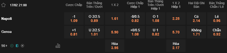 Cũng trong ngày 17/2, Napoli và Genoa sẽ có màn so tài tại vòng đấu thứ 25 giải Serie A. Hiện tại sau 23 vòng đấu Napoli vẫn đang dẫn trước tại top 9 trên BXH với tổng 35 điểm, trong đó 5 trận gần nhất toàn đội có cho mình 2 trận nổ kèo Tài 2/2.5 FT, Genoa đang bám đuổi ngay phía sau tại top 12 với tổng 29 điểm, 5 trận gần nhất Genoa cũng đang có cho mình đồng 2 trận nổ kèo Tài. Xét về thành tích đối đầu, dựa trên lần gần nhất gặp nhau cả Genoa và Napoli đều có thành tích khá cân bằng khi nổ kèo Tài 2/2.5 FT trong trận hòa 2 đều, vì vậy xiên kèo đặc biệt đang đánh giá kèo Tài là lựa chọn sáng giá để nhà đầu tư cân nhắc đặt kèo trong trận đấu này.