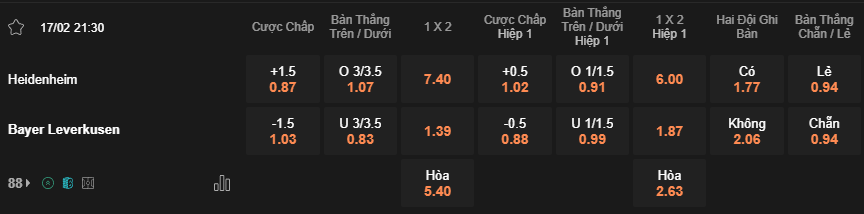 Tại Bundesliga, Heidenheim cũng sẽ tiếp đón Bayer leverkusen trên sân nhà tại vòng đấu thứ 22 trong ngày 17/2 tới đây. Hiện tại Bayer Leverkusen đang một mình một ngựa tại vị trí top 1 trên BXH với tổng 55 điểm sau 21 vòng đấu, trong đó Leverkusen đang có 3 trong số 5 lần gần nhất ra sân nổ kèo Tài 3/3.5 FT. Ngược lại Heidenheim phía bên kia sân đang có thành tích khá khiêm tốn tại vị trí top 9 cùng tổng 27 điểm, trong đó chưa trận nào trong số 5 lần ra sân trở lại đây nổ kèo Tài 3/3.5 FT. Lần gần nhất Heidenheim đối đầu với Leverkusen cũng không mấy suôn sẻ khi để thua 1-4 nổ tài 3/3.5 FT, với thành tích đối đầu trước đó Leverkusen vẫn đang là cái tên được đánh giá cao cho kèo Tài trong trận này.