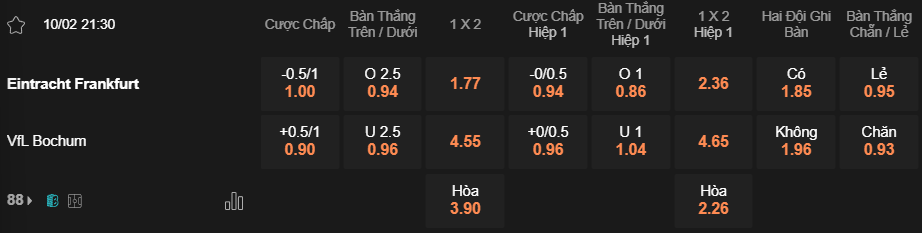 Cũng trong ngày 10/2, Frankfurt và Bochum sẽ có màn đối đầu tại vòng đấu thứ 21 Bundesliga. Hiện tại Frankfurt đang bỏ xa Bochum khi sau 20 trận Frankfurt đã có cho mình tới 31 điểm để vươn lên vị trí top 6 trên BXH, ngược lại Bochum khá lép vế khi để mất điểm tới 4/ 5 lần ra sân gần nhất và tạm thời đứng tại top 14 cùng tổng 21 điểm. Xét về khả năng nổ kèo Tài 2.5 FT, 5 lần ra sân gần nhất cả Frankfurt và Bochum đều chưa thể thành công nổ kèo Tài, 2 lần gặp nhau trở lại đây cả hai đội cũng đều kết thúc với tỷ số hòa 1 đều. Vì vậy keo xien thom hom nay đang đánh giá khả năng kèo Xỉu 2.5 FT đang là lựa chọn an toàn để các nhà đầu tư cân nhắc đặt kèo trong trận này.