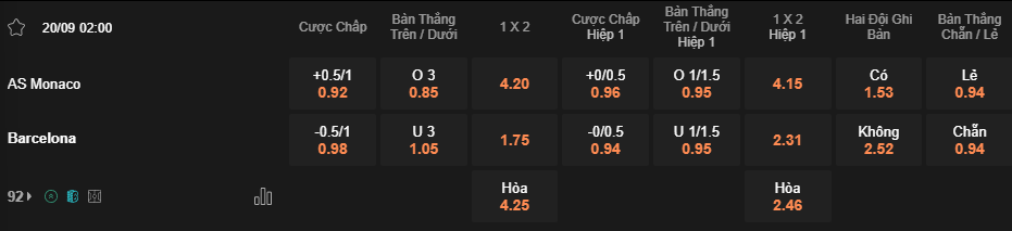 Monaco và Barcelona cũng sẽ có màn đối đầu tại C1 trong ngày 20/9 này. Nhận định khả năng đạt kèo tài Xỉu của hai đội, 5 trận ra sân gần đây có 2 trận nổ kèo Tài với trung bình đội ghi được 3 bàn/trận, trái lại Barcelona cũng có đồng 2 trận đạt kèo trong đó đội ghi được cao nhất tới 7 bàn. Trong lần chạm trán gần nhất giữa hai đội kèo Tài cũng nổ nghiêng về Monaco với chiến thắng 3-0 trước Barcelona, vì vậy cân nhắc trận này các chuyên gia lựa chọn kèo Tài 3 FT hoàn toàn khả thi cho các nhà đầu tư.