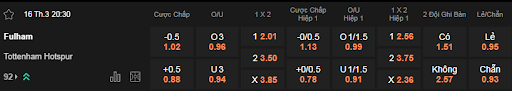 Kèo đấu giữa Fulham vs Tottenham được các chuyên gia phân tích trong kèo thơm vào lúc 20h30 ngày 16/3. Chúc các bạn đặt kèo thành công.