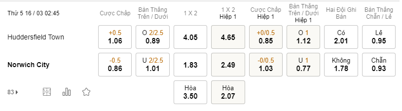 Tỷ lệ kèo Huddersfield vs Norwich