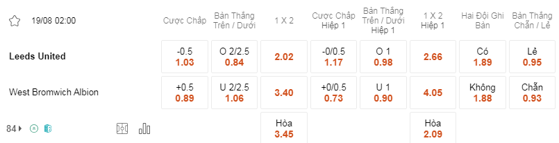 Tỷ lệ kèo Leeds vs West Brom