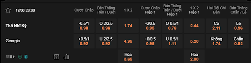 Tỷ lệ kèo Thổ Nhĩ Kỳ vs Gruzia