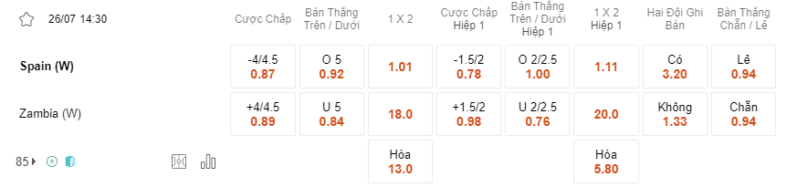 Tiếp nối hai trận đối đầu trên tại bảng C thì vào ngày 26/7 tới cũng sẽ diễn ra cuộc so tài giữa Spain Women vs Zambia Women trong khuôn khổ vòng loại World Cup Nữ. Theo xiên bóng đá hôm nay ở cuộc so tài này cũng sẽ không có quá nhiều bất ngờ khi Tây Ban Nha, đội bóng đang xếp vị trí thứ 2 cũng vừa xử đẹp đội bóng cùng bảng là Costa Rica với tỷ số 3 - 0 ngay tại hiệp 1 trong khi Zambia lại là cái tên làm nền cho đội tuyển Nhật Bản khi ăn tới 5 bàn không gỡ. Đây thực sự sẽ là một thế trận dễ đoán khi Zambia không thể hiện được quá nhều tại đấu trường quốc tế trong khi Tây Ban Nha đã là cái tên có số má và hiện tại họ đã bất bại tới 7 trận liên tiếp trên mọi đấu trường và trước đó Tây Ban Nha cũng đã từng ghi hủy diệt đội tuyển Việt Nam với tỷ số 9-0. Khả năm kèo tài 5 bàn trở lên sẽ là lựa chọn hợp lý khi Tây Ban Nha hoàn toàn có thể làm chủ được cuộc chơi trong trận tới và 5 bàn có lẽ sẽ không nói được hết tất cả trong thế trận của kèo đấu tới đây.