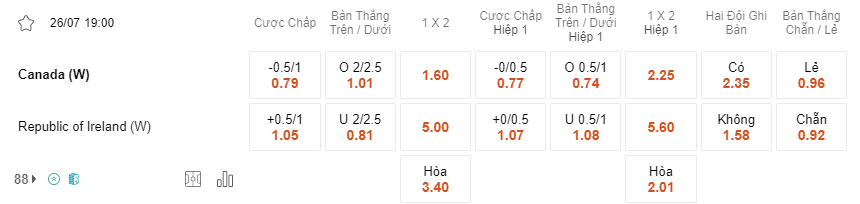 Ở khuôn khổ bảng B giải World Cup Nữ vào ngày 26/7 tới cũng sẽ diễn ra màn so tài giữa Canada Women vs Ireland Women. Có thể thấy Canada đang có một sự nhập cuộc không quá tốt khi họ đã phải chia điểm với Nigeria sau 90 phút thi đấu ngay cả khi đối thủ của Canada đã phải chơi thiếu người. Trận tới đây có thể sẽ nghiên về Canada khá nhiều ghi họ may mắn sẽ đối đầu với Ireland một đối thủ được cho là không quá mạnh và mới để thua trước Úc với tỷ số 0-1. Theo các chuyên gia, đây có lẽ sẽ là cơ hội tốt để Canada có thể gia tăng cách biệt với đối thủ phía dưới là Nigeria nếu dành chiến thắng trước Ireland trong trận tới. Tuy nhiên kèo tài cùng không phải là một lựa chọn an taonf cho các nhà đầu tư khityr lệ 2/2.5 bàn có lẽ sẽ là hơi cao so với những gì Canada thể hiện trước đó. Kèo Xỉu sẽ là lựa chọn hợp lý nhất cho các nhà đầu tư trong trận tới đây.