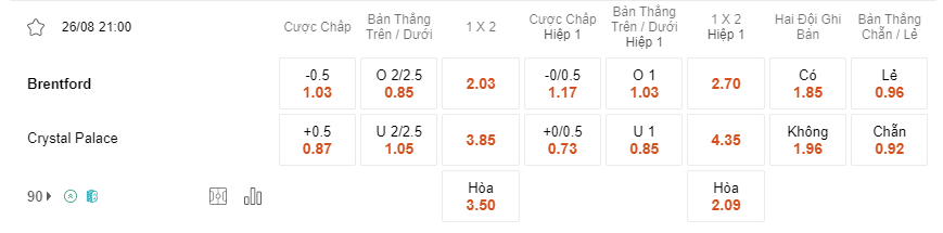 Kèo HT trong trận tới đây đang nghiêng khá nhiều về phía Brentford với tỷ lệ lên tới 1.17 cho kèo 0/0.5 bàn, đây là một kèo khá dễ hiểu khi 2 trận gần nhất Brentford đều ghi bàn ngay trong hiệp 1 của trận đấu trong khi bên phía Crystal Palace trong chiến thắng trước Sheff Utd trước đó phải tới phút thứ 49 của hiệp hai bàn thắng mới tới dành cho đội chủ sân Selhurst Park. Kèo HT dành cho Brentford hoàn toàn là một sự lựa chọn tốt dành cho các nhà đầu tư trong lượt đấu tới đây.