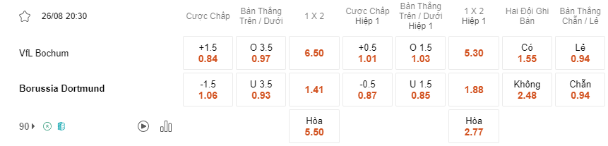 Cũng trong ngày 26/8, kèo đầu giữa Bochum vs Dortmund trong khuôn khổ vòng đấu thứ hai giải Bundesliga. Có thể thấy sau một mùa giải thi đấu tuyệt vời khi Dortmund đã gần sát với ngôi vô địch tuy nhiên ngôi vô địch lại thuộc về Bayern khi có số bàn thắng cao hơn tuy nhiên không thể phủ nhận rằng đoàn quân của HLV Edin Terzic đã thi đấu vô cùng xuất sắc khi kết thúc mùa giải ở vị trí top 2 cùng 71 điểm và đặc biệt J.bellingham đã có một màu giải cực cháy tại Dortmund cùng màn chuyển nhượng 103 triệu Euro tới Real Madrid đã khiến Dortmund trở thành đội bóng thành công hơn cả tại giải Vô Địch Đức. Trong khi đó đội chủ nhà Bochum lại thể hiện phong độ trái ngược với đối thủ khi chỉ xếp thứ 14 cách 2 điểm so với nhanh đèn đỏ ở mùa giải năm ngoái, tới mùa giải năm nay Bochum cũng không thể hiện phong độ khá tệ trong trận ra sân đầu tiên khi để thua tới 5 bàn không gỡ trước Stuttgart. Theo kèo xiên tối nay khả năng cao Dortmund sẽ có cho mình chiến thắng tiếp theo trên sân nhà Bochum và với tỷ lệ kèo tài 3.5 bàn là tỷ lệ hợp lý cho các nhà đầu tư trong kèo đấu tới đây.