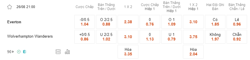 Everton và Wolves cũng sẽ có màn so tài trong ngày 26/8 tới đây trong khuôn khổ vòng đấu thứ 3 tại Ngoại Hạng Anh. Có thể thấy cả hai đội sau hai vòng đấu đầu tiên đều không có được một kết quá tốt, với đội chủ nhà Everton toàn đội liên tiếp phải nhận về hai trận thua trong đó gần nhất Everton để thua trước Aston Villa với tỷ số không thể nào tệ hơn 4-0 trên sân khách, trong khi đó Wolves chỉ đứng trên Everton 1 hạng cũng đang phải nhận về vô số chỉ trích với 2 trận thua tệ trong đó Wolves cũng để thua 1-4 trước Brighton tại vòng đấu thứ hai vừa qua. Theo các chuyên gia, việc cả hai đội đều đã để thua trong trong hai vòng đấu đầu tiên đang khiến cả hai đều khát khao có cho mình một chiến thắng trong trận đấu sắp tới đây tuy nhiên ở 2 cuộc đối đầu trước đó Wolves lại có phần nhỉnh hơn với 1 chiến thắng và ở lượt đấu gần nhất 2 đội hòa nhau với tỷ số 1 đều. Khả năng kèo tài với tỷ lệ 2/2.5 nổ trong trận này không quá cao với những gì cả hai đã thể hiện trong vòng đấu đầu tiên và kèo XỈu sẽ là lựa chọn an toàn nhất cho các nhà đầu tư.