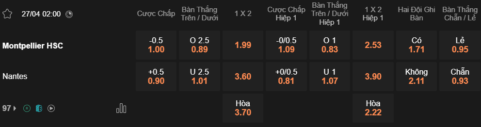 Tại vòng đấu thứ 31 Ligue 1, cũng trong ngày 27/4 này Montpellier sẽ chạm trán với Nantes trên sân nhà Stade de la Mosson. Hiện tại sau 30 vòng đấu tạm thời Montpellier đang đứng cao hơn tại top 12 với tổng 36 điểm, trong đó thành tích đạt kèo của đội không quá ấn tượng khi Montpellier chưa có trận nào đạt kèo trong số 5 lần ra sân trở lại đây. Trong khi đó Nantes với 31 điểm đang tạm thời đứng tại vị trí top 14 trên BXH, trong đó bình quân với chỉ đạt 1 bàn/trận Nantes cũng đang không quá có duyên với khả năng nổ kèo 2.5 FT. Dù vậy xét về khả năng đối đầu Nantes đang nắm phần hơn khi có tới 2 chiến thắng với 1 trận đạt kèo Tài 2.5 FT trong khi Montpellier chỉ có cho mình 1 trận thắng, vì vậy kèo Tài 2.5 FT vẫn có thể là lựa chọn hợp lý được đánh giá bởi soi kèo ngon thơm trong trận này.