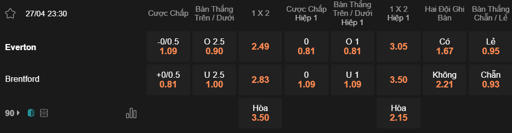 Everton và Brentford cũng sẽ có màn đối đầu tại vòng đấu thứ 35 Ngoại Hạng Anh trong ngày 27/4 tới đây. Sau 34 vòng đấu cả hai đội đang cạnh tranh sát nút ở gần cuối BXH với Brentford đạt 35 điểm tạm thời dẫn trước tại top 15 trong khi Everton với 33 điểm đang đứng ngay phía sau tại top 16 trên BXH. Xét về khả năng đối đầu Everton đang có thành tích áp đảo trong cả 3 lần chạm trán trước đó với 2 chiến thắng và 1 trận hòa trong số đó đội có 1 trận nổ kèo Tài 2.5 FT, dù vậy 5 trận gần đây chỉ Brentford là đội nổ kèo 2.5 FT với tổng 2 trận đạt kèo. Dù vậy với khả năng nổ kèo tốt hơn các chuyên gia tại nhà cái vẫn thiên về khả năng đạt kèo của Brentford trong trận này với tỷ lệ 1.00 cho khả năng nổ Tài 2.5 FT.