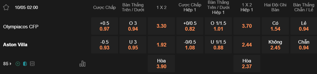 Về khả năng đạt kèo hiệp 1, Olympiacos đã có cho mình tổng 3 trận nổ kèo HT với cao nhất đội ghi được 2 bàn/hiệp, trong khi đó dù Aston Villa cùng có đồng 3 trận đạt kèo tuy nhiên với việc 3 trận liên tiếp trở lại đây đội đều chưa thể có chiến thắng các chuyên gia đánh giá Olympiacos là lựa chọn tin cậy hơn cho các nhà đầu tư cho kèo 0/0.5 HT.
