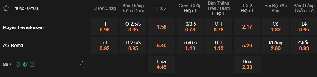Cũng trong ngày 10/5 này, tại Europa League sẽ diễn ra cặp đấu giữa Bayer Leverkusen và AS Roma trên sân BayArena. Ơ Lượt trận trước Leverkusen đã có cho mình chiến thắng cách biệt 2-0 trước AS Roma qua đó gần như đội đã bước một chân vào tấm vé chung kết Europa League. Dù vậy xét về khả năng đạt kèo Leverkusen đang chỉ có duy nhất 1 trận nổ kèo Tài 2.5/3 FT trong khi AS Roma chưa có bất kỳ trận nào đạt kèo trong vòng 5 lần ra sân gần nhất, bên cạnh đó cả 3 lần đối đầu gần nhất hai đội chưa có bất kỳ trận nào nổ Tài 2.5/3 FT. Vì vậy khả năng soi kèo ngon thơm nhận định kèo Xỉu 2.5/3 FT đang là lựa chọn an toàn cho các nhà đầu tư trong trận đấu này.